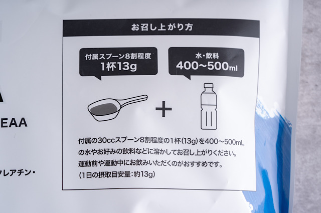 付属のスプーン8割程度(13g)を、400〜500mlの水やスポーツドリンクで割る