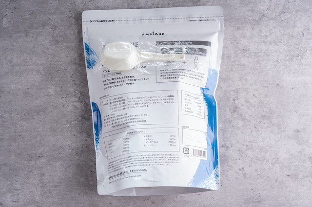 アンビークオールインワンEAAは、必須アミノ酸9種類に加え、筋トレサポート成分(β-アラニン・クレアチン・グルタミン・HMB・クエン酸)が配合されています。