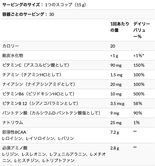 そして1スクープ(15g)あたり10gのEAA(内略 EAA:2.8g BCAA:7.2g)なので少ない量で効率的にEAAを摂れます。