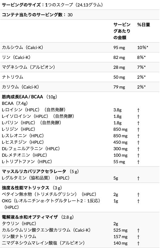 必須アミノ酸9種類の他にも電解質やグルタミンがとれるので、筋トレ後のリカバリーまで期待できます。