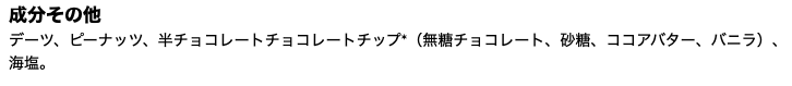 デーツ、ピーナッツ、半チョコレートチップ(無糖チョコレート、砂糖、ココアパウダー、バニラ)、海塩-ピーナッツバターチョコレートチップ味の原材料表示-